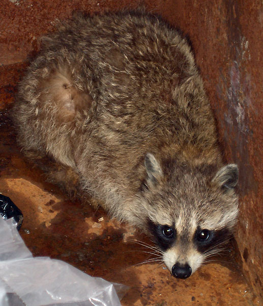 Так вот этот енот, видимо, залез в мусорку с той же целью - поискать нечто вкусное, но не смог выбраться обратно. Край мусорки был очень высок.